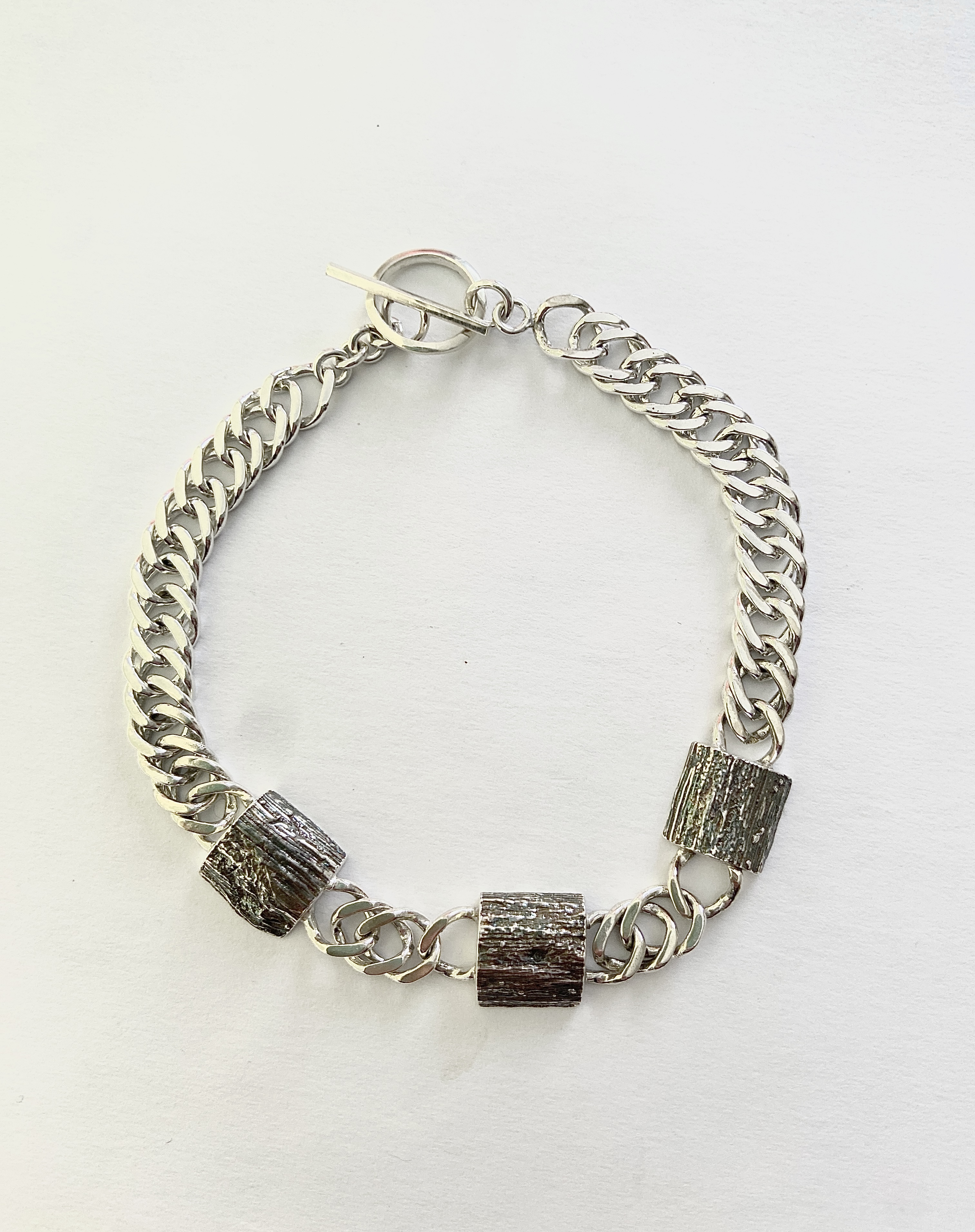 Pulsera Plata con cadena reciclada con piezas fundidas a la cera perdida con texturas de madera de Lenga, recogida del bosque austral.